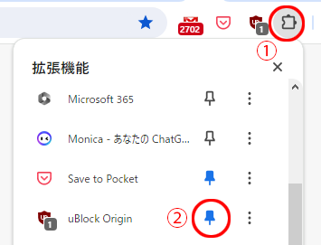 このジグソーパズルみたいなアイコン(これが拡張機能のアイコンです)をクリックして…